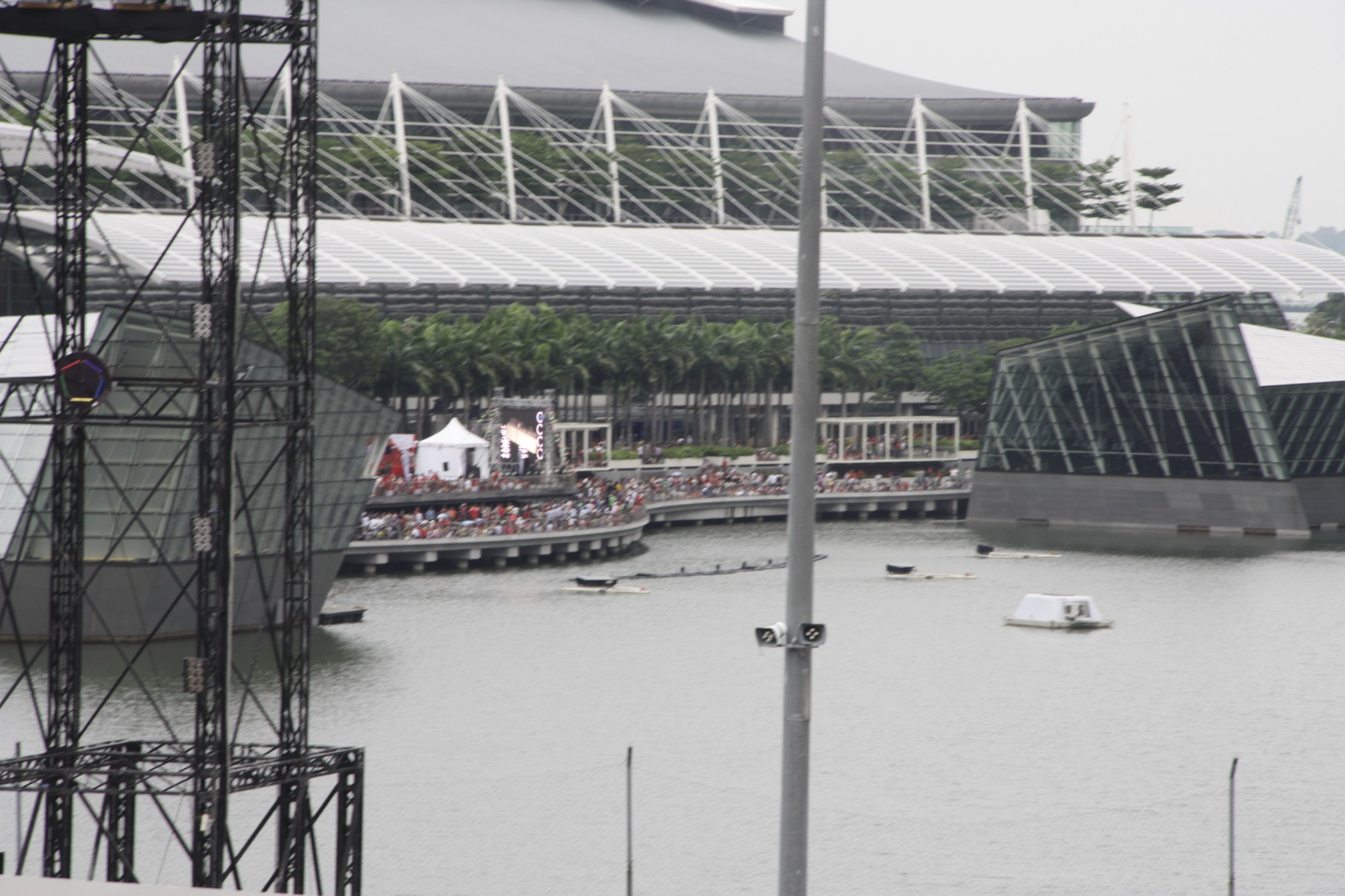Going in to the parade I was not too sure what to expect. On my first trip to Singapore, in February of this year, I saw the stage being constructed and wondered what it was. Now, 6 months later, I was going to find out! When I arrived at NDP2013 a sea of people wearing red and white greeted me. Red and white are the colors of Singapore’s flag. Red for equality and brotherhood of man. White for purity and virtue. After about an hour and multiple security checks I was finally on my way into The Float @ Marina Bay. I was also given a gift bag, which was a backpack full of goodies from food and drinks to flags and clappers. From there I went to my seat and sat down for the show. The live televised portion of the show consisted of three main parts, the dynamic defense display, the parade and ceremony, and the show. You can watch these portions in their entirety in the video embedded below. Please note I have added time stamps in red to the rest of my article referencing time in this video.