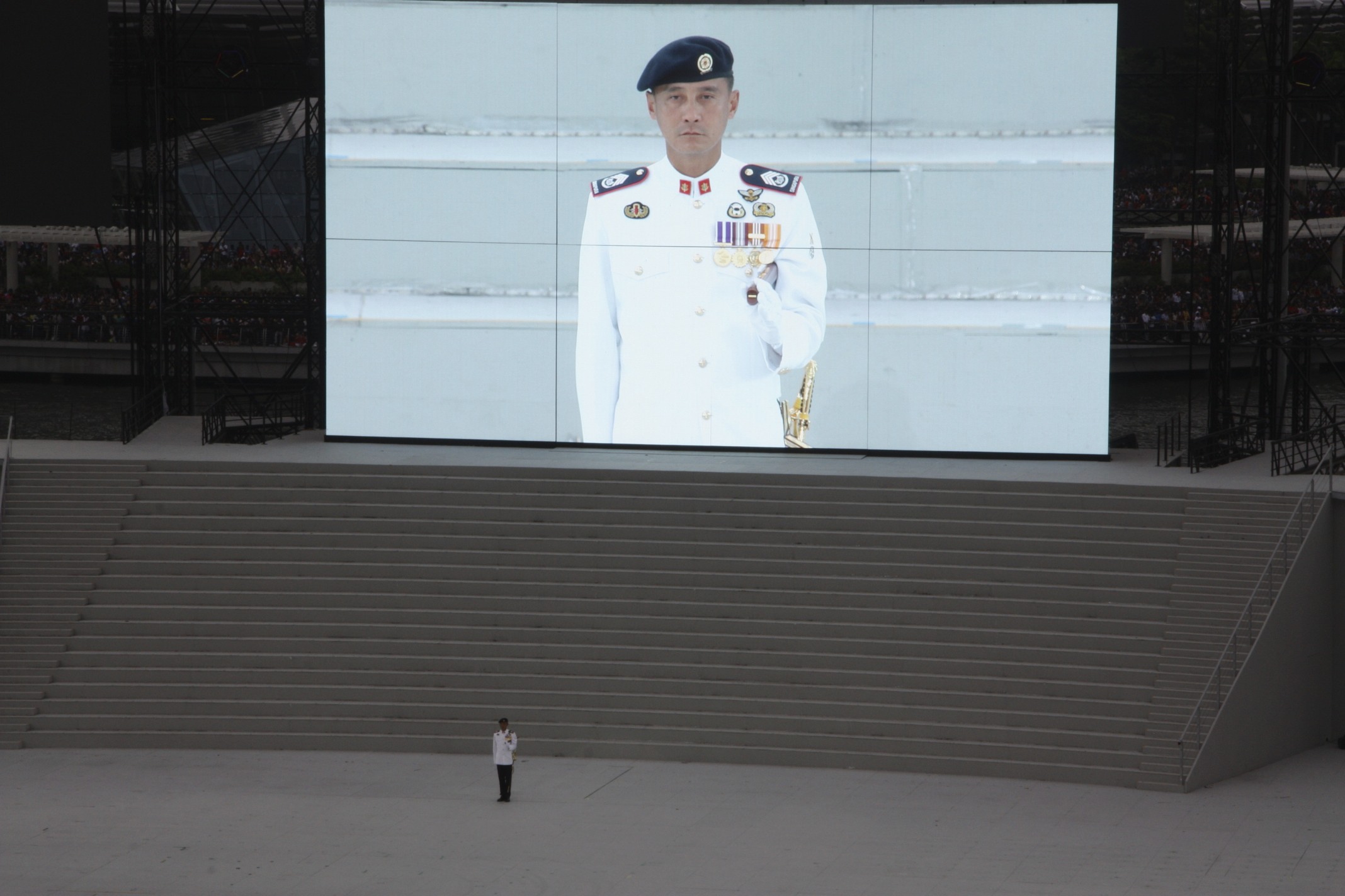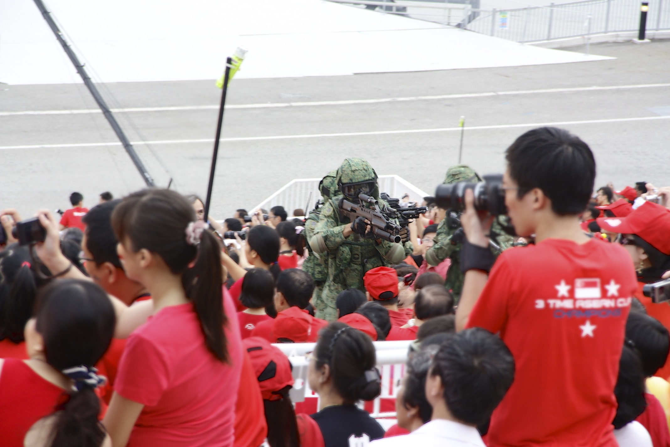The Dynamic Defense Display is a way for Singapore to show off their military hardware and assets from the home team. During this segment several scenarios were displayed by the Singapore Armed Forces (SAF), Singapore Police Force (SPF), and Singapore Civil Defense Force (SCDF). Displays showing new military technology, new police programs, and fire and rescue techniques. I have seen parades in the past where these types of organizations have marched past a street crowd, but what I saw at NDP was completely different. Most organizations provided a scenario, in which they showed how they would overcome the problem to find a solution. I was most impressed with the Singapore Police Force who acted out a scenario of a hostage takeover 24:55. For a moment I thought I was watching the stunt show at Universal Studios Singapore and not at NDP! The dynamic defense segment ended with hundreds of kids coming out in military uniforms showing off the future of Singapore’s defense. I thought that this portion of the show was the perfect propaganda needed to get young Singaporean’s in the correct mindset to join one of these services. All male Singapore citizens and non-first generation permanent residents will be required to put in two years of their time into either the SAF, SPF or SCDF once they reach 18 years of age. After the dynamic defense display it was time to start the parade and ceremony.