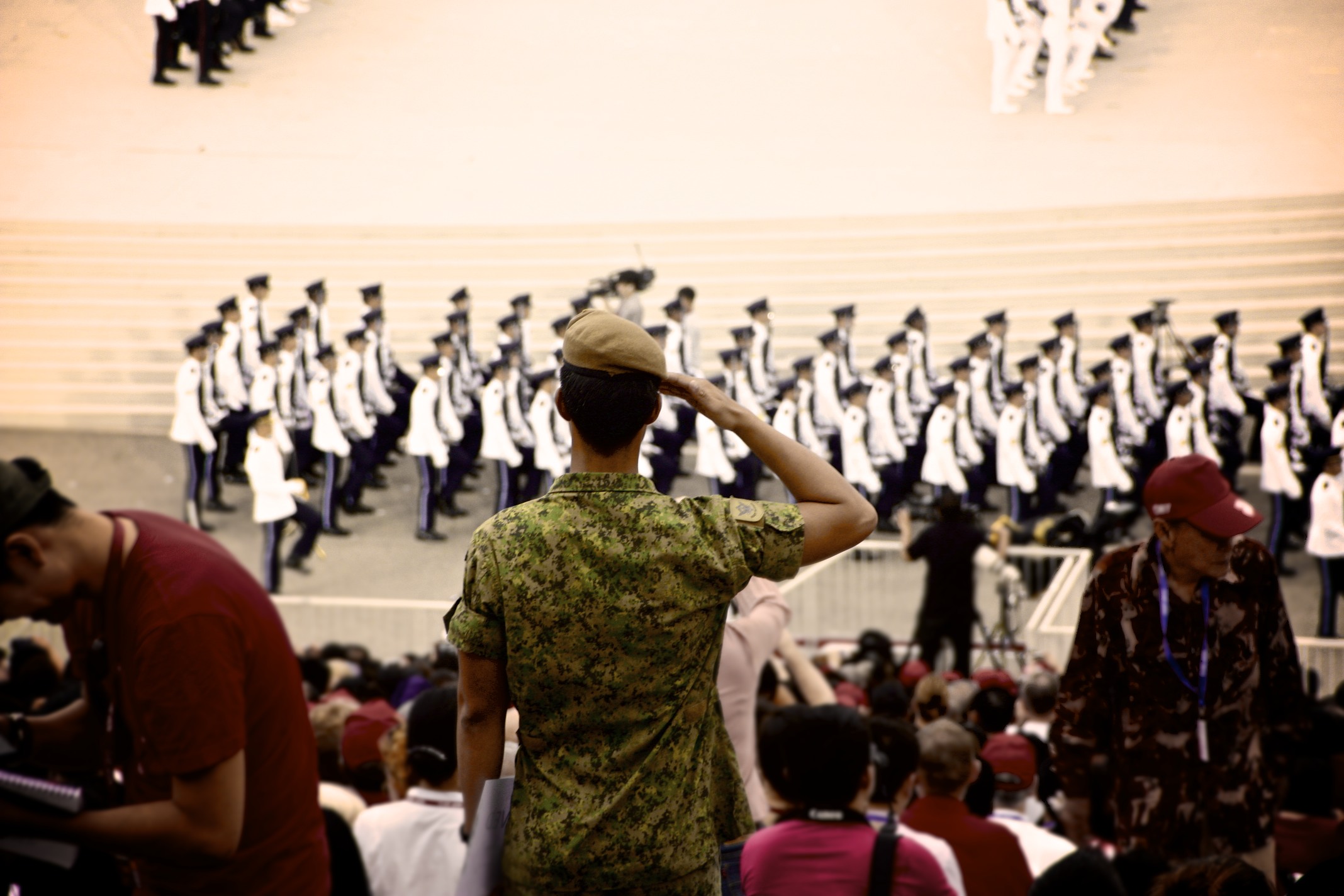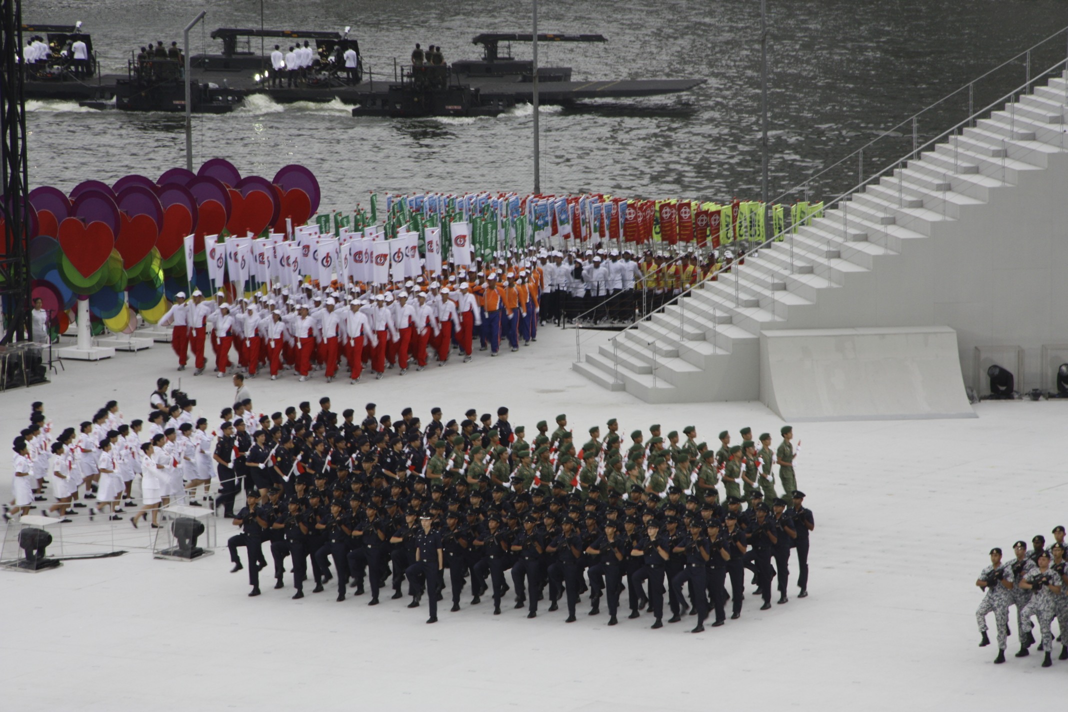 After another school choir performance the audience was asked to rise for the entry of Singapore’s third and current prime minister, Lee Hsien Loong. The eldest son of Lee Kuan Yew took his seat after a nice round of applause. The choir then sung the song “Count on me Singapore”. This song encouraged future development and positivity by building a better world and counting on the resources of Singapore. After the song it was time to stand for Tony Tan Keng Yam’s arrival 1:04:50. Tony Tan is the President of Singapore. Once he arrived, the Majulah Singapura (onward Singapore), Singapore’s national anthem was played. This followed by a fly by of five F-16 Fighting Falcons from the Republic of Singapore Air Force, saluting the nation. Three F-15 Strike Eagles followed with their afterburners on. A nice way to wake up anyone sleeping in the nearby hotels. After that the parade commander asked the president to inspect the parade, which the president agreed to do. As the president was inspecting the parade a 21 gun salute was being held in his honor. The president did stop along the way to talk to several military members. What was chatted about is unknown, but I am sure very special for both parties. The president approved the inspection of the parade and took his seat. Four more F-15 Strike Eagles flying in diamond formation and five F-16 Fighting Falcons showed off their precision flying skills. The next segment of the show was the march pass of all of the marching contingents. These contingents represented the marching guard contingents, the five pillars of total defense (military, civil, economic, social and psychological), the 25 other contingents being made up of the SAF, uniformed groups, local organizations, and civilian contingents.